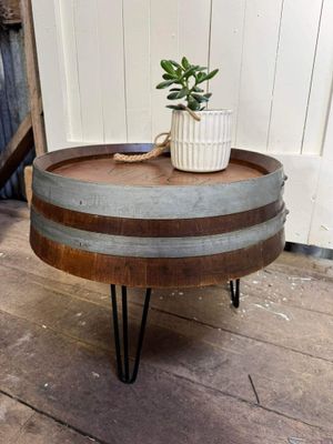 Custom designed hand made wine barrel table, complete with hand painted graphics